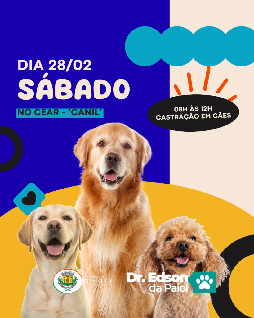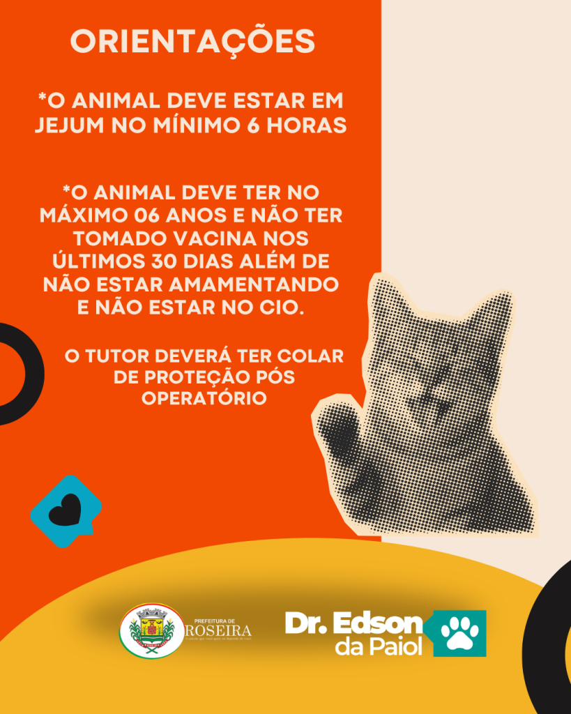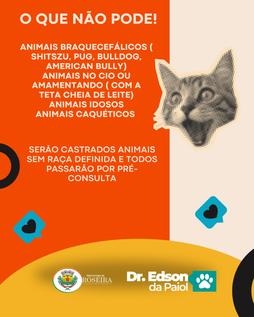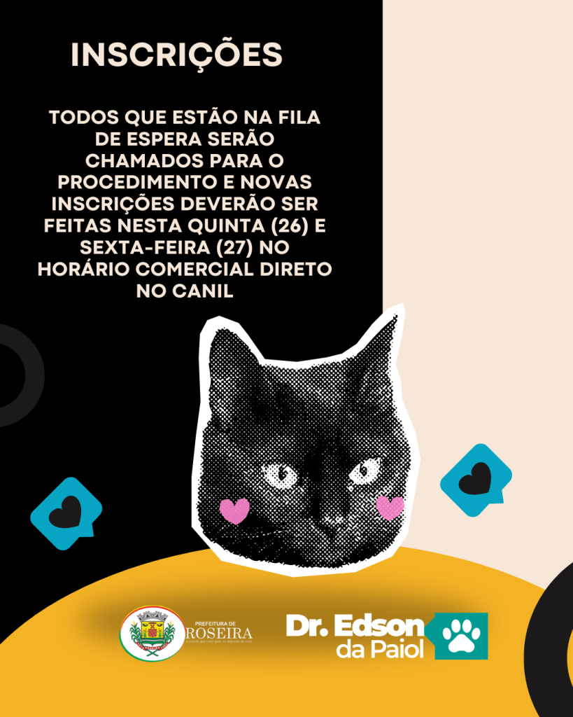 A Prefeitura de Roseira em parceria com o Dr. Edson da Payol realiza neste sábado, 28, das 08h às 16h, um mutirão de castração em cães e gatos no CEAR (Centro de Esterilazação de Animais de Roseira). Todos da lista de espera serão chamados e novos procedimentos poderão ser feitos, mediante a inscrição que podem ser feitas nesta quinta e sexta-feira em horário comercial no Canil. Acompanhe os posts para entender mais: